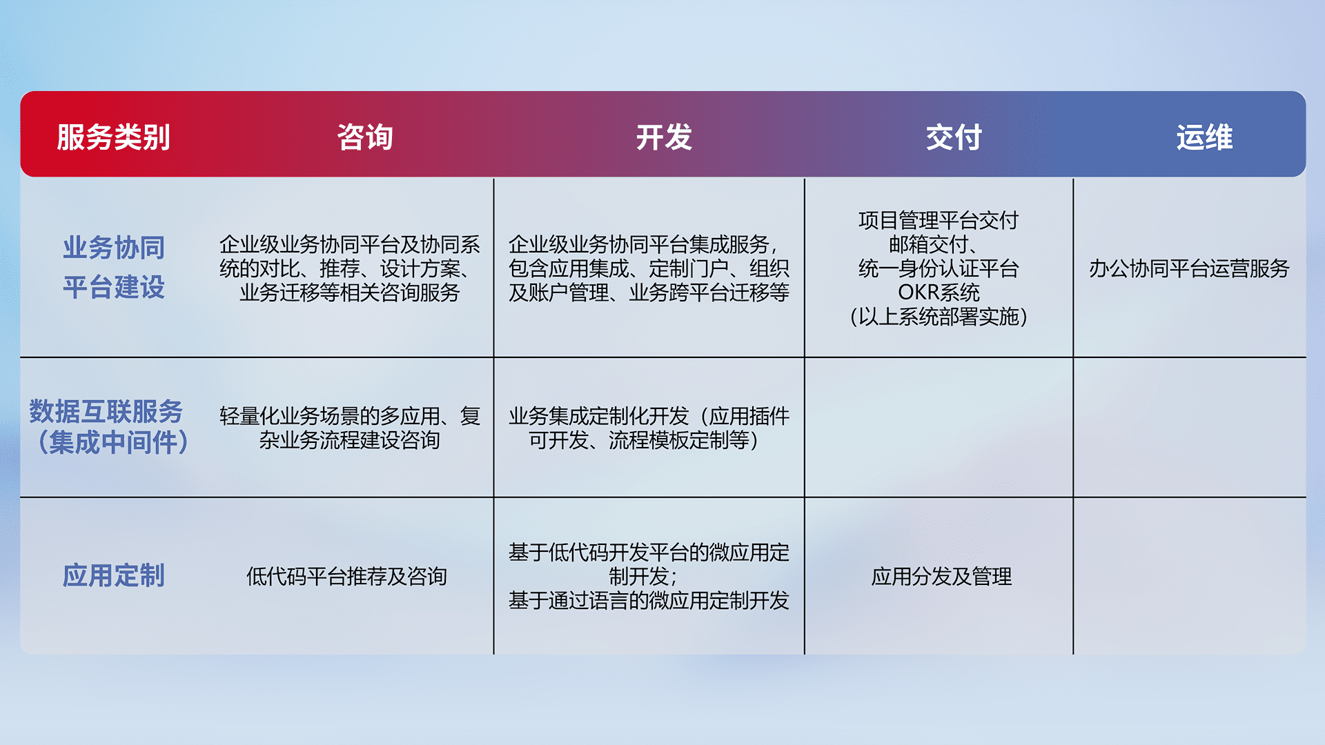 针对钉钉、、、、企微、、、、IDaas等平台级产品提供产品的规划、、、、方案、、交付、、、、定制化开发等服务,,实现如统一协同办公、、、智能客户服务、、、混合会议管理、、、智能数据查询、、等业务场景,,,,实现数字化转型。。