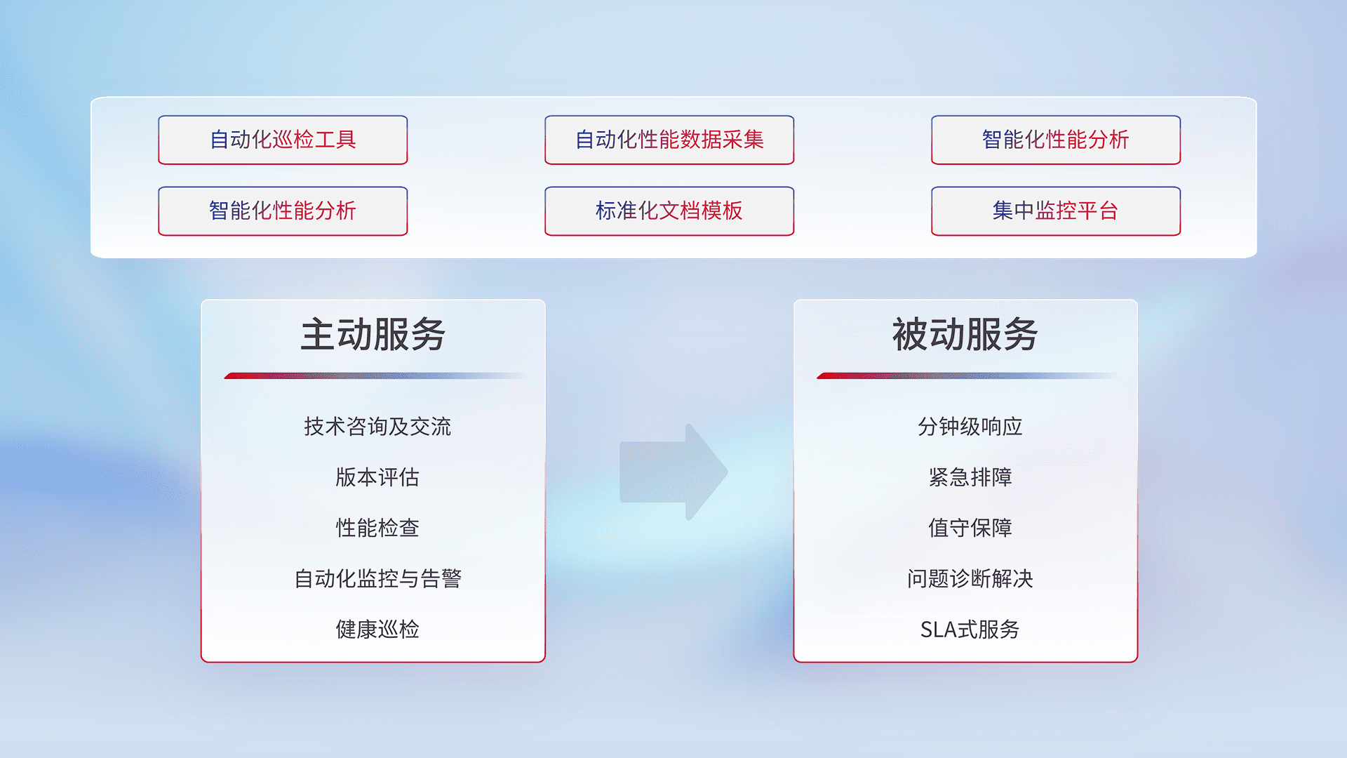 智能化工具和标准化文档,,保障服务质量,,,提供主动服务(包含技术咨询、、版本评估、、、、性能检查、、、自动化监控与告警、、、健康巡检)和被动服务包含(分钟级响应、、、紧急排障、、、、值守保障、、问题诊断解决、、、、SLA服务)。。